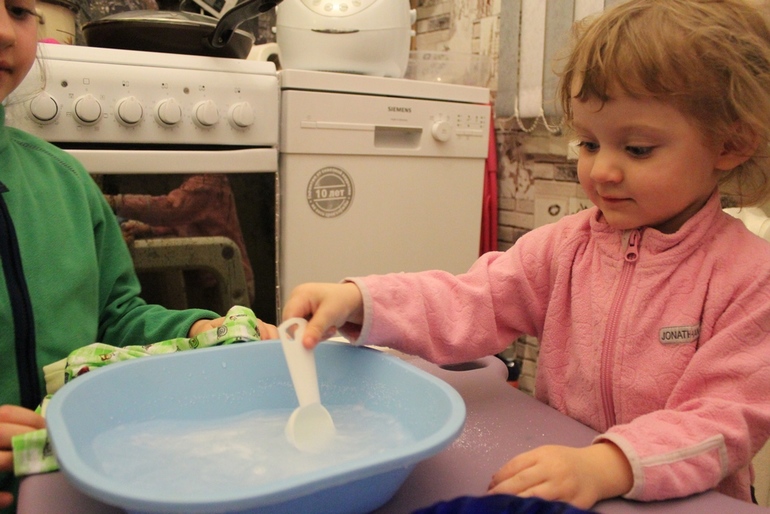 К сожалению, большая стирка у нас не получилось. Мы решили стирать не кукольные вещи, а новую пижаму Риты. Ручную стирку решено было устроить на кухне, поскольку ванная очень маленькая. Набрали в тазик теплой воды, Рита с удовольствием насыпала порошок. И все! На все остальные действия Рита реагировала категоричным "Нет!". Хотела только насыпать в воду порошок. Потом совсем оскандалилась. Успокоилась после предложения пойти в ванную купаться.