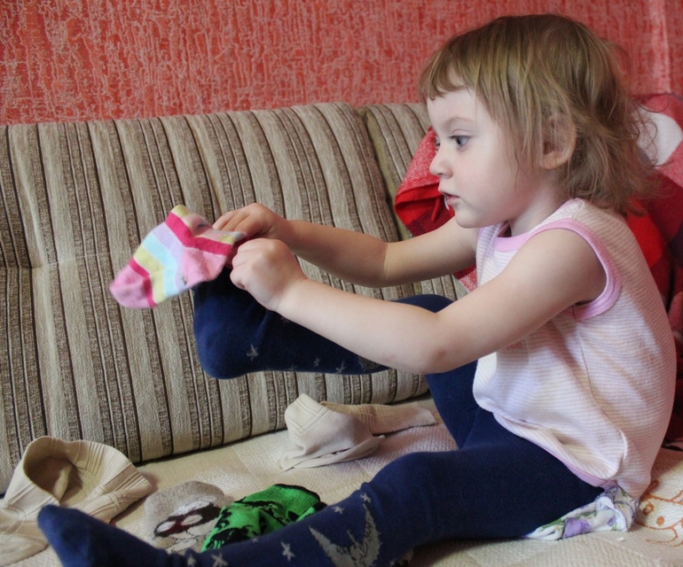 Очень понравилась игра "Носки и носочки". Понравилась особенно тем, что вызвала много трудностей у Риты. Только после моего показа у Риты получилось подобрать пару для носочков. Пыталась мне одеть носок Алисы - не получилось, надела себе. После стали вкладывать носки один в другой, пробовали прятать в носки мелкие игрушки. Теперь будем играть в эту игру чаще.