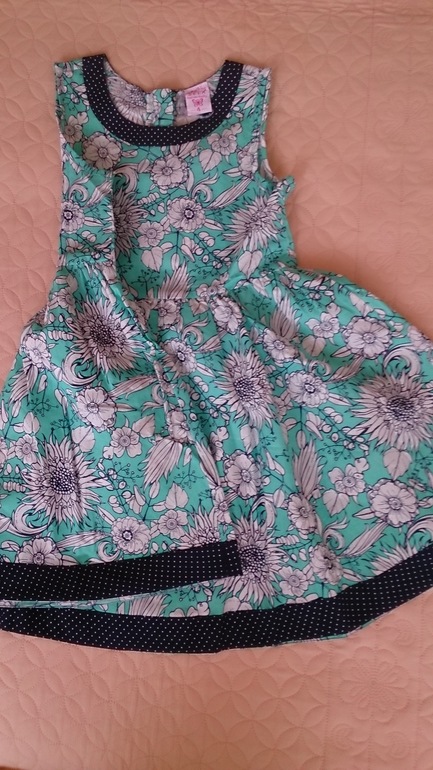 Платье Sela в красивой расцветке, размер 104-110. Состав 100 % хлопок (не трикотаж). Основной цвет - мятный. Дополнительные - белый и темно синий. Сзади застегивается на молнию. Прекрасный вариант для жаркой погоды. Полуобхват по груди почти 30 см - 950 р.