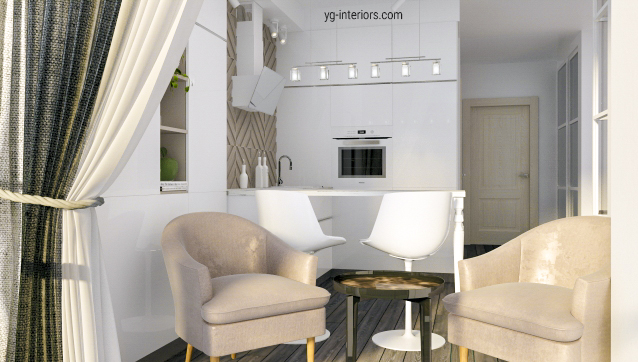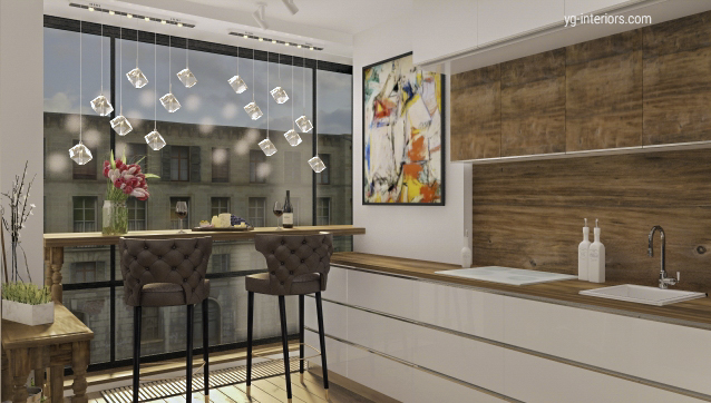 Кухню совместили с зоной гостиной, барная стойка достаточно широка, чтобы использовать ее как полноценный обеденный стол.