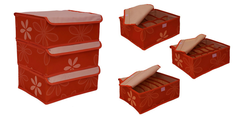 Внутреннее пространство каждой из трех секций комплекта разделено на боксы, в которые можно складывать одежду или различные аксессуары. Изделие выполнено из прочной качественной ткани, которая прослужит долгие годы. С помощью органайзера вещи удобно хранить или перемещать с одного места в другое.
