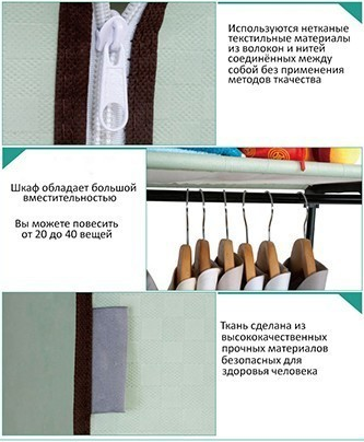 В основе тканевого шкафа лежит прочный металлический каркас, именно он обеспечивает жесткость конструкции. Шкафы из ткани по внутреннему строению ничем не отличаются от обычной мебели: в них есть все приспособления для удобного хранения ваших вещей. Шкафы для одежды можно использовать в качестве гардероба в прихожей дома или на даче .