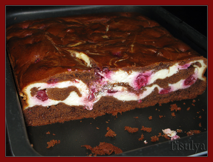 Ингредиенты: Шоколад горький - 100 г Масло сливочное - 120 г Сахар - 150 г Яйца - 4 шт Мука пшеничная - 150 г Разрыхлитель (без горки) - 1 ч. л. Творог (мягкий) - 300 г Ванильный сахар - 1 пакет. Вишня замороженная (без косточек) - 400 г Соль (щепотка)