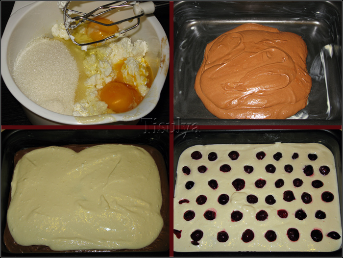 Шоколад поломать на кусочки. Растопить вместе с маслом, на водяной бане или в микроволновке. 2 яйца и 50 грамм сахара взбить миксером, добавить щепотку соли и ванильный сахар. Для творожного крема - творог смешать с сахаром и оставшимися яйцами (2 шт.). Растереть миксером до кремообразного состояния. Если творог зернистый, протереть его предварительно через сито. Во взбитые с сахаром яйца, добавить остуженный, растопленный шоколад, затем разрыхлитель и муку. Перемешать миксером, на самой низкой скорости. В форму с высокими бортиками, смазанную сливочным маслом, выливаем 1/3 теста. Распределяем по форме. Выкладываем половину творожной массы. Если она густая и не растекается - разровнять лопаткой. По творожной массе распределить половину вишни. Далее: тесто, масса, вишня, тесто. Тесто стараться распределить равномерно, где-то это может не получаться, это не страшно. По верхнему слою, можно сделать разводы ножом или деревянной палочкой. Выпекать 40-50 минут в разогретой до 180 градусов духовке. Готовность проверить лучинкой - она должна быть сухой. Остудить в форме.
