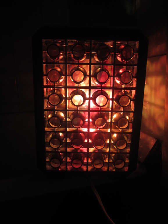 Раритет :) Светильник, внутри цилиндр, который сажается на тонкую проволоку. Надо крутануть и закрыть крышку, какое-то время цилиндр будет крутится и рассеивать цветной свет. Работает, но выключатель должен посмотреть мужчина - немного ослаб механизм держания 200 руб