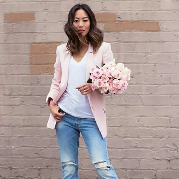 Джинсы с заниженной талией сейчас не модные, всю картинку портят. Пиджак классный, и длина у него что надо и цвет вам идёт.