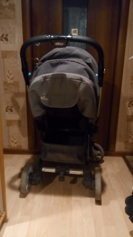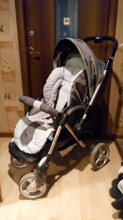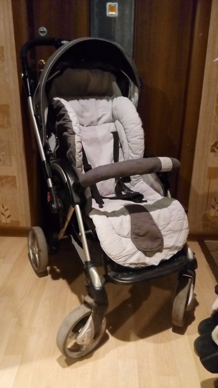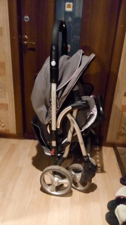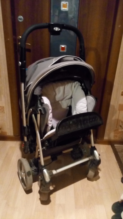Очень удобно складывается, одной рукой! Перекидная ручка. Складывание:книжка ,5-ти точечные ремни, бампер. Регулировки:спинка, подножка Рама:алюминий Ширина шасси:55 см Вес в сборе:10 кг. Состояние не плохое, после одного ребенка. Не работает тормоз!