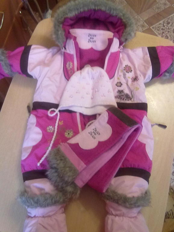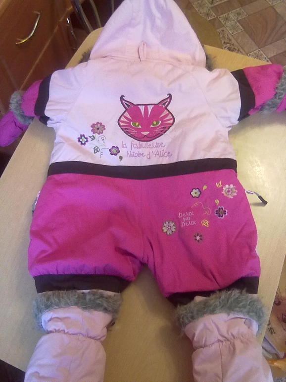 Красивущий комбез размер с 6 мес и больше, меньше будет великоват, в хорошем состоянии(кое-где облупилась краска на рисунке, на фото видно), за 2500, в подарок две флисовые поддевы и розовая шапочка в тон, живу в Самаре, с почтой дружу)).