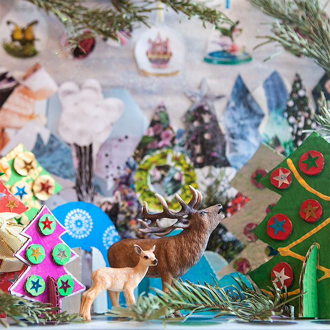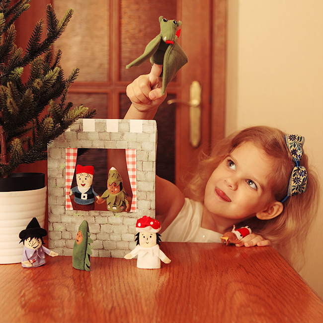 Делать аппликации из старых журналов, а потом использовать их в качестве новогодних декораций к мини-театру. Подробно я показывала здесь.