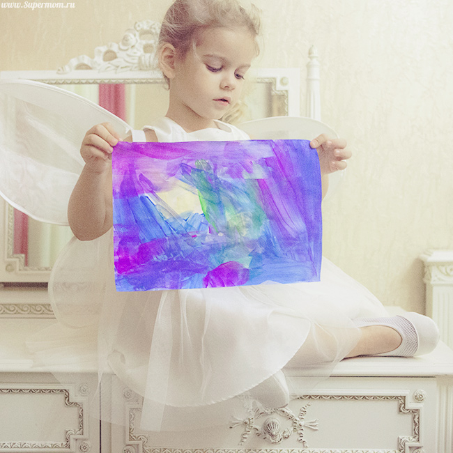 По этому же принципу Алиса пытается рисовать свои собственные картины. Например, закат. И демонстрация с комода в платье, ну папа же пришел!