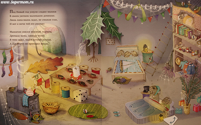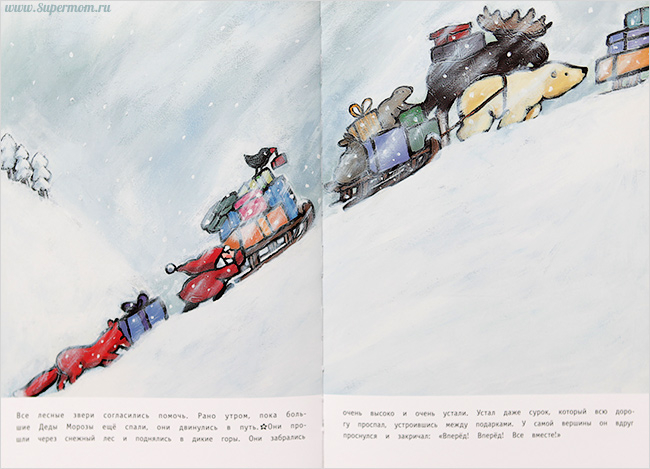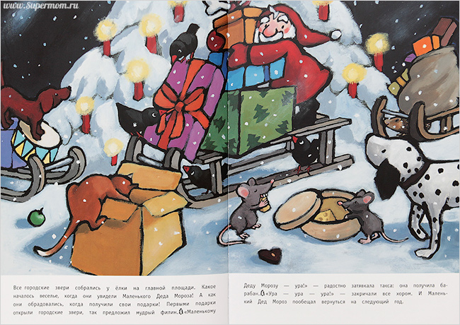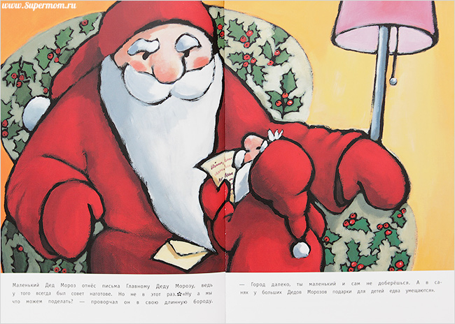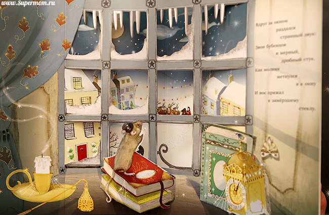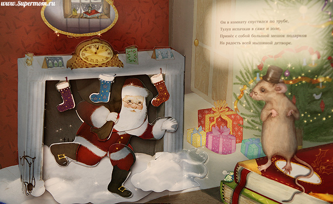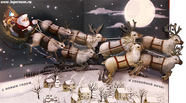 Задумка этой книги очень хороша: когда ее открываешь, картинки оживают, появляется объем. Что-то можно даже двигать руками, дергая за язычки. И иллюстрации заряжают настроением, хотя по тексту опять расходятся Санта Клаус и Дед Мороз. Я все-таки учу ребенка, что это разные персонажи, приходится объяснять, что автор перепутал.