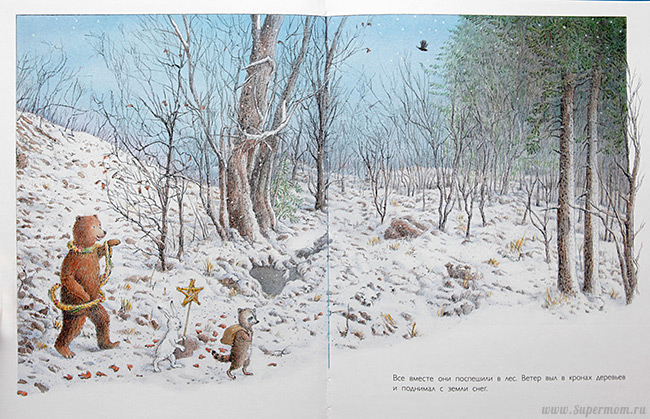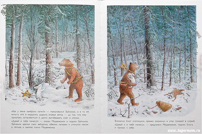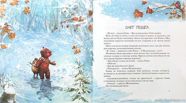 И иллюстрации и сам текст очень уютные, зимние и теплые. Сама книга состоит из множества коротеньких рассказов. Именно рассказов, а не сказок. Про то, как потеплело, и медвежонок с ежиком не знали, топить им печку или нет, а потом решили пойти завтракать к речке. Или про то, как снежинка звала ежика гулять, но называла его поросенком, потому что ежик прислонился носом к стеклу своего окошка и его нос стал похож на пятачок, а ежик все не пог понять, где же этот поросенок, которого зовет снежинка, и бегал на улицу искать его. Вот как-то так. Просто, душевно и без крутых поворотных сюжетов.