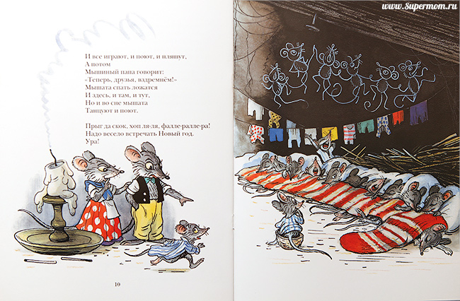 В этой книге мое взрослое впечатление совершенно противоречит Алисиному. Я вот, например, считаю, что кроме талантливых иллюстраций Сутеева тут больше ничего особенного. Никаким настроением книга не заряжает. Весь сюжет: убрались, поиграли, поели, поспали, надо весело встречать Новый год, ура! "Ура" при таком раскладе для меня выглядит абсолютно дежурным, потому что "надо".