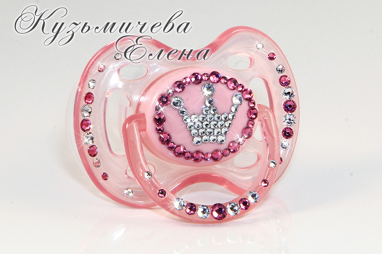 Соска с кристаллами Сваровски - это весьма оригинальный подарок на рождение малышки, который безусловно порадует и маму! С такой соской Ваша принцесса может блистательно дефелировать на прогулке или использовать ее для красивых снимков во время фотосессий. А когда девочка подрастет, сосочка станет для нее приятной памятной вещицей из детства.