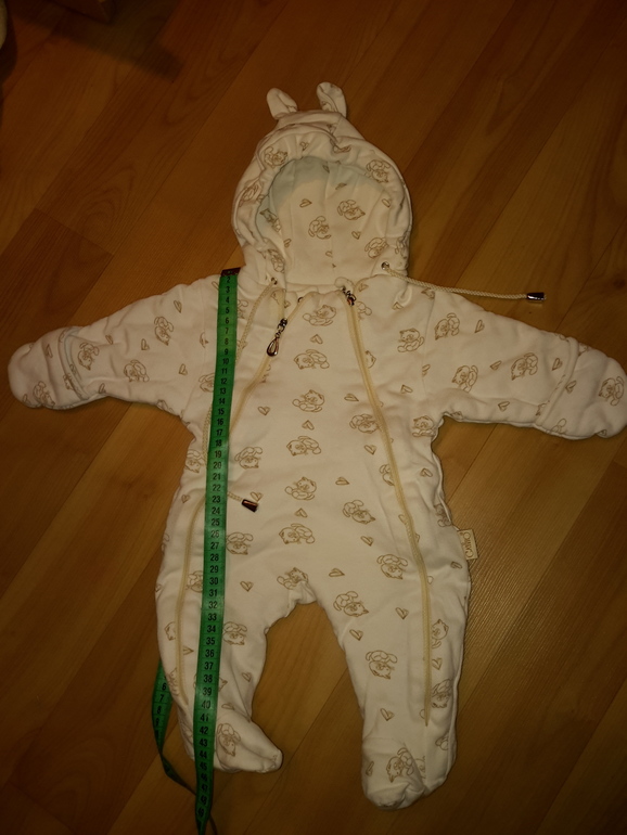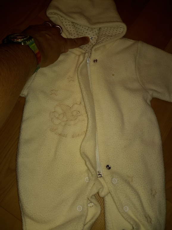 Внутри хлопок, снаружи флис. Цвет белый, но не кипельно. На животике молния, на ножках кнопочки. Расстегивается целиком, удобно малыша класть
