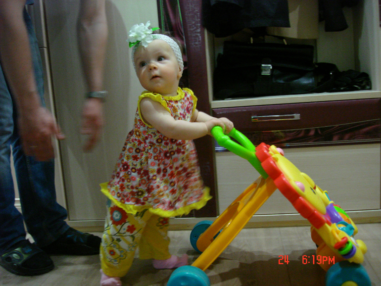1. Навыки: пытается сделать первые шаги. Расставляю ей табуретки по кругу и она пробует перейти от одной к другой. Катает мяч ко мне и ловит. Складывает игрушки в свою кроватку. Вещи из стиральной машинки перекидывает в ванную. Приносит игрушки мне в руки.