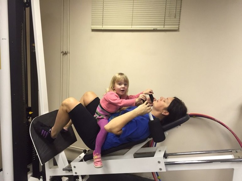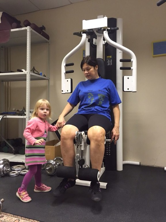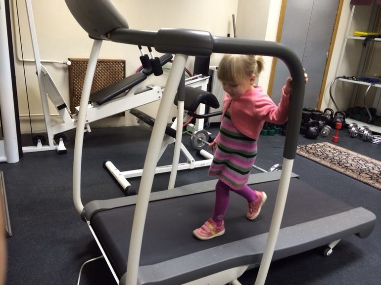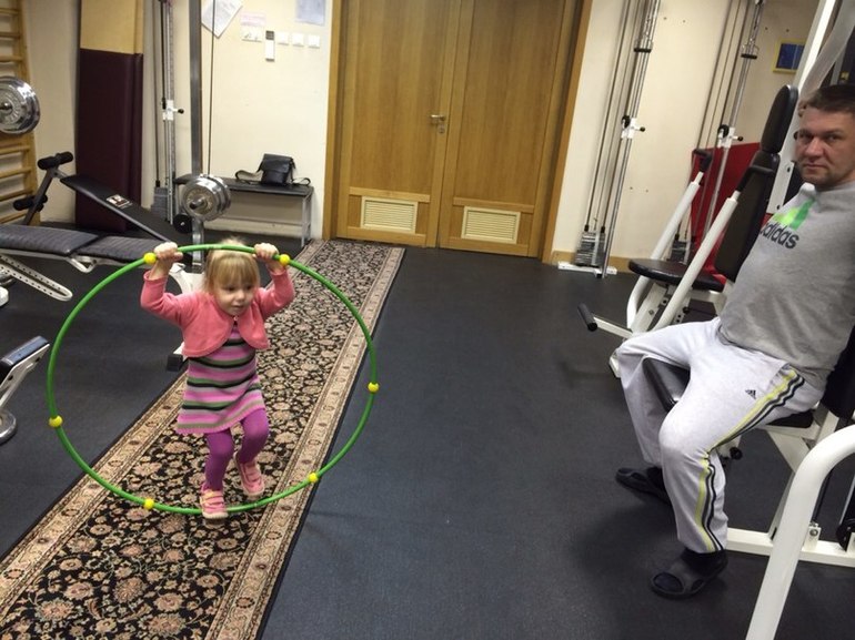В спортзале (16:30) нас ждал папа! Мы рассмотрели какие мышцы бывают у людей (на инструкции к тренажерам) и у папы (фото папа запретил категорически (кокетничает), позадавали провокационные вопросы: а где же у мамы мышцы??