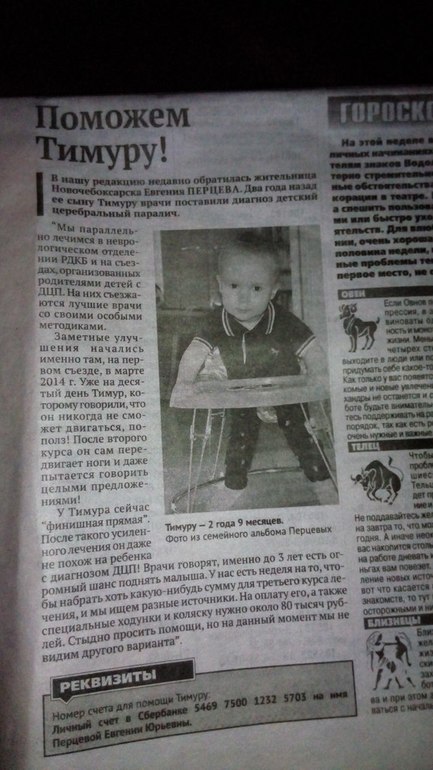 Как многие уже знают совсем скоро мы уезжаем на лечение, на которое мы не успеваем собрать сумму. На наше счастье откликнулась газета нашего города "Грани", очень было много вопросов к нам, все долго и упорно проверяли(все данные о Тимошке) и наконец то сегодня вышла статья,думаю это наш сегодняшний подарок :) Спасибо Всем тем кто откликнулся нам помочь,всем тем добрым людям,что встречаются на нашем пути! Спасибо Вам за теплые слова поддержки, я каждый день получаю сообщения от Вас самыми светлыми пожеланиями. А мы держим кулочки и верим в то,что все получиться! :)