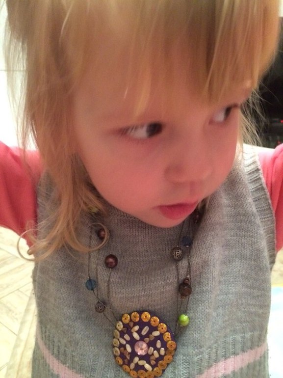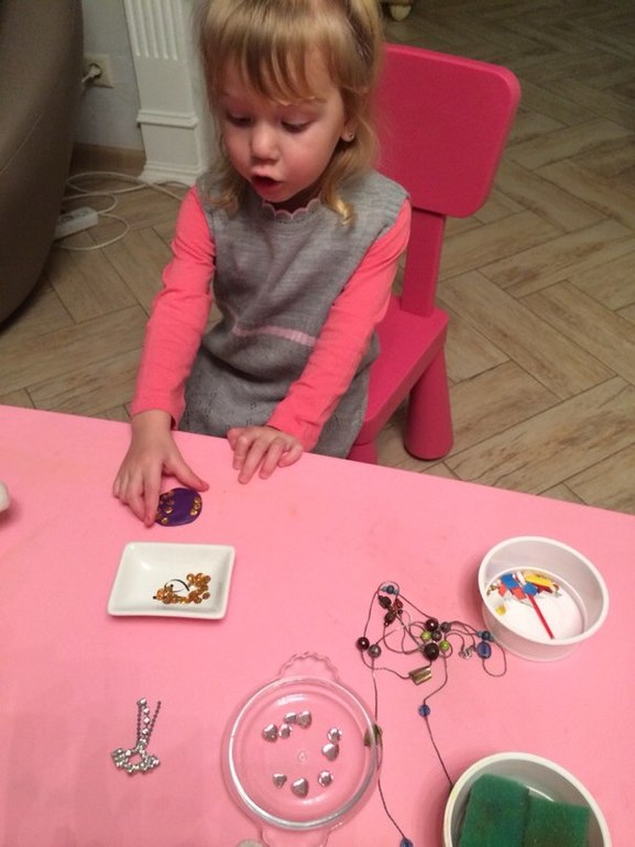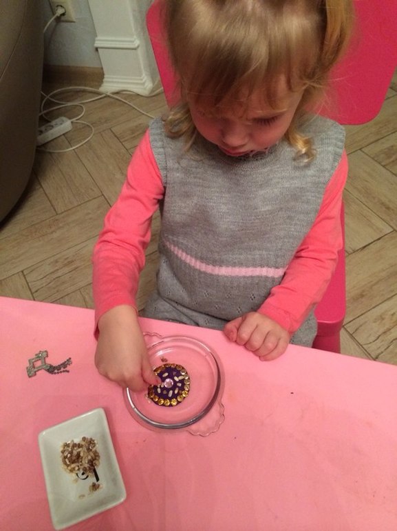 Время до сна еще было, в интернете показала броши (день мы этот пропустили!) и, вот что значит девочка - на украшения переключилась! Вспомнила про мамину шкатулочку с разными дамскими блестючими штучками) Стала просить поиграть! А вот именно брошей у меня и нет. Решили срочно сделать свою, краасииивую: