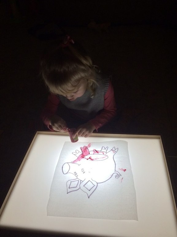 19:00 что-то я не решилась разукрашивать опять окно (только отмыла от новогодних раскрасок) поэтому перенесла выбранный Соней рисунок на пленку (от букета цветов) и за световым столиком стали мы ваять свой витраж...~5 минут максимум, покалякали на стекле