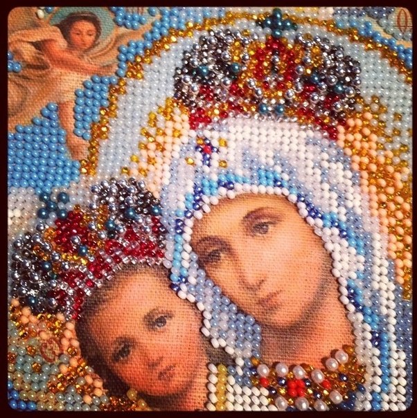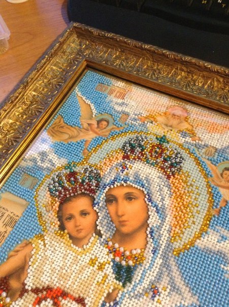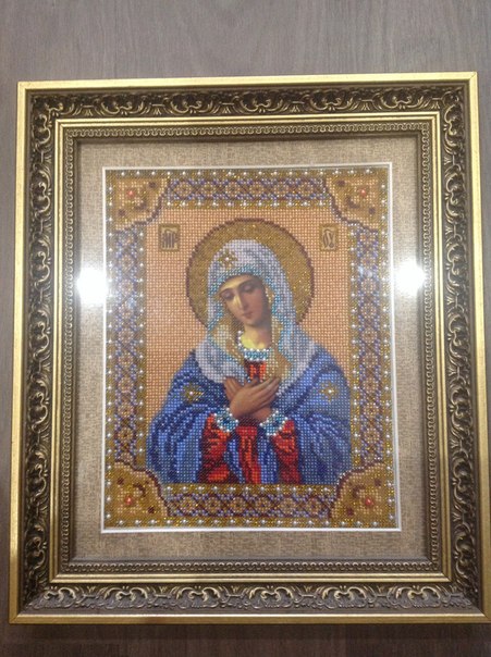 Богородица Милующая , из чешского бисера, вышивку обрамляет оконтовка золотого цвета, плюс вышивка оформлена в багет благородного золотого цвета