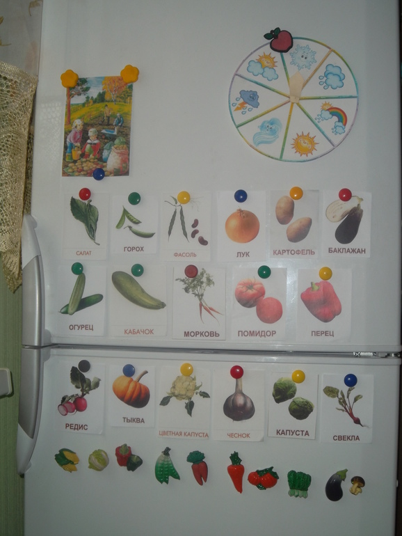 Сначала просмотр информационной стены, каждое утро я добавляла по несколько карточек с овощами, большинство Рома знал. Повторили известное, изучали незнакомое. Под срезом много фото.