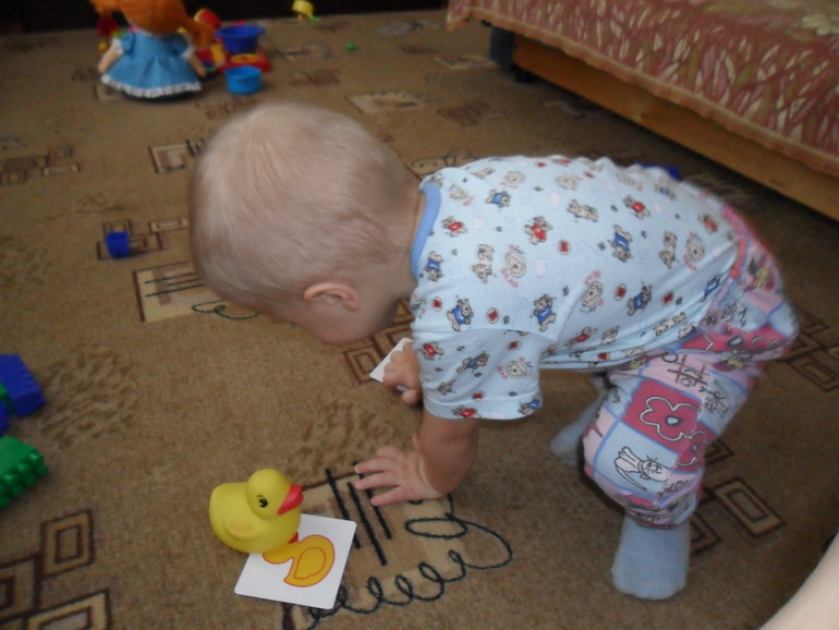 На моторику были прищепки опять, кормили уточек травкой, рвали надрезанную зеленую бумагу, и кормили пшеном, искали уточкам домик из игры гномики и домики по цвету, выкладывали последовательность большой, средний, маленький на игрушках, и на карточках (пока Роман не очень понимает смысл)