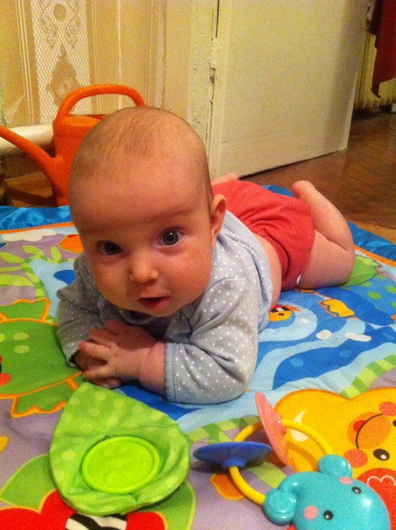 Следующей сегодняшней умелкой стало долгожданное хватание игрушек. Положила я девочку на коврик на животик, прицепила пару игрушек, чтобы скучно не было и начала рядышком пол мыть. (Коврик на полу, не рискую я с высокими поверхностями больше). Слышу, Маришок кряхтит и ругается, глянула, а она одну игрушку держит, а вторую схватить пытается, да достать не может. Поругалась, попыхтела и добралась. ))) Подтянуть ножки и проползти не догадалась, правда. Все впереди. Растёт наш малышок!