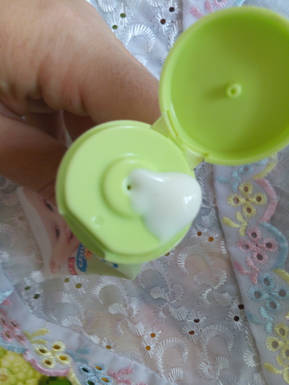 Разочарованная во всех детских кремах я открыла этот тюбик. Сразу отмечу, что тюбик тоже небольшой, но с удобной защелкивающейся крышечкой.