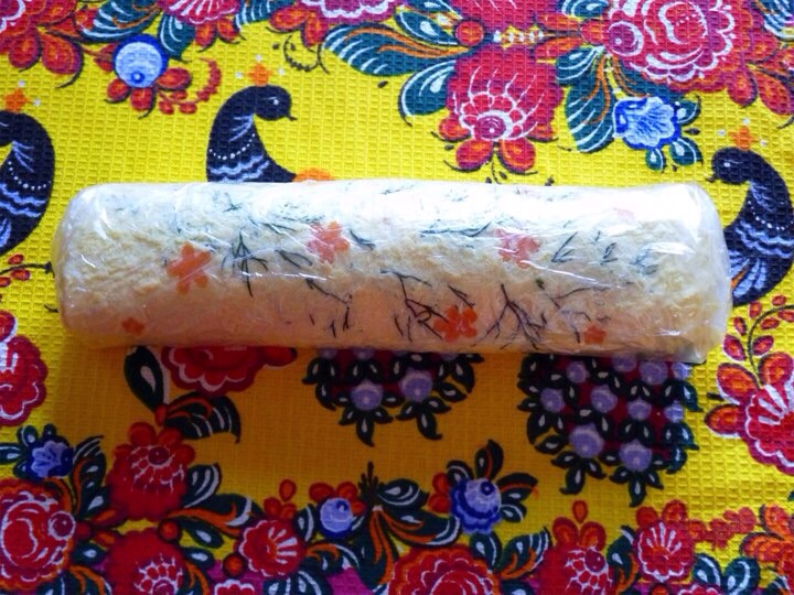 Рулет завернуть в эту же пленку, обязательно завернув и края рулета.