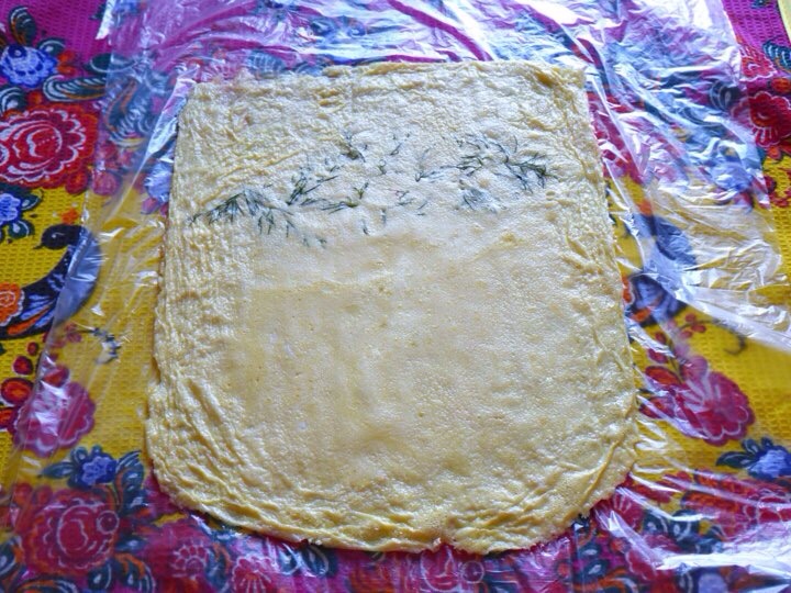 Готовый омлет достать из духовки, дать немного остыть и аккуратно, вместе с пергаментом, перевернуть на пищевую пленку. Очень аккуратно снять пергамент, чтобы не порвать омлет! Если у вас получились не очень ровные края - расстраиваться не стоит, их потом все равно не будет видно.