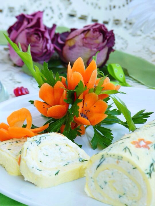 Цветы и бабочки для украшения я сделала из моркови, можно из сырой или готовые цветы приготовить в пароварке.