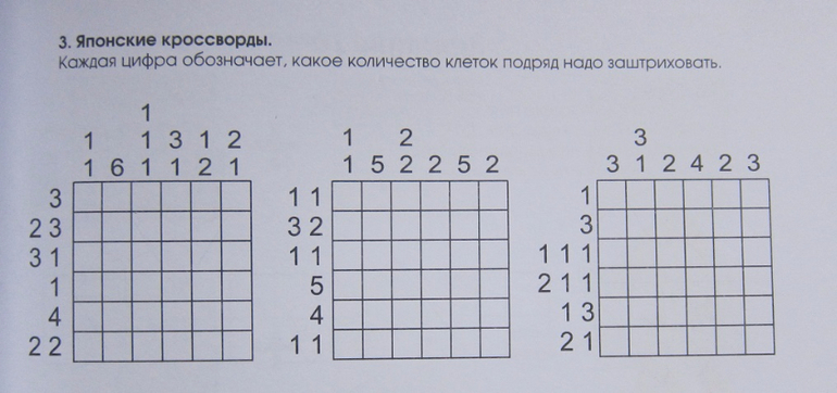 Первое, что меня порадовало - это японские кроссворды. Я еще не встречала их в детских пособиях. Данька сначала говорил, что трудно, но спустя уже 10 минут решал на раз-два. Сейчас совместно решаем кроссворд 20 на 20 клеток.