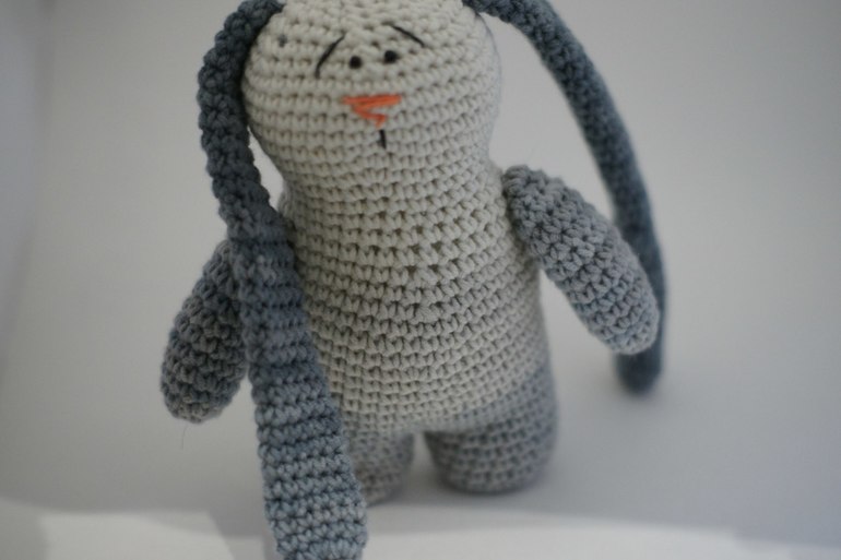 Изготовлен из пряжи хлопок-акрил, вышитые хлопковыми нитками глазки абсолютно безопасны в игре.