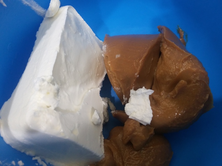 Для крема взбить 1 банку вареной сгущенки с 1 пачкой творожного сыра (маскарпоне, рикотта, альметте и т.п.):