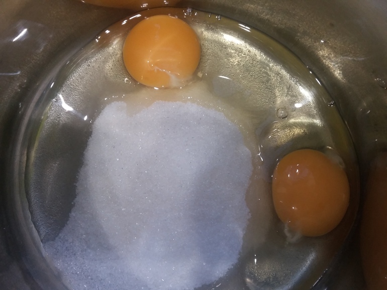 Положить в металлическую или стеклянную миску 2 яйца и стакан сахара: