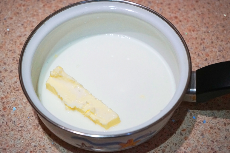 Добавить в не большую емкость молоко, сливочное масло, соль
