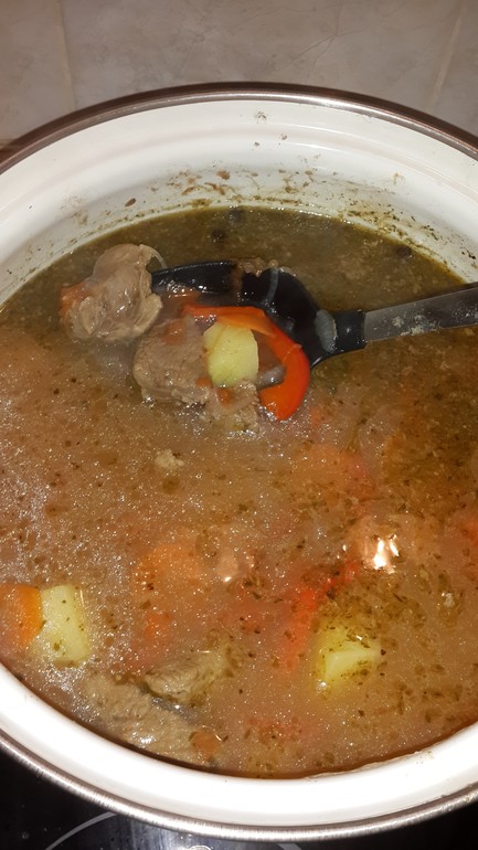 мясо обмыть, обсушить, достаточно крупно нарезать и отправить в кастрюлю обжариваться на медленном огне. после добавляем нарезанный полукольцами лук, потом крупно нарезанную морковь, затем помидоры, после перец и самом конце картофель. заливаем содержимое кастрюли водой, добавляем соль и специи по вкусу ( у меня приправа для шурпы, сушёная зелень) и кладём в суп неочищенную целую головку чеснока. доводим до готовности, убираем чеснок и наслаждаемся. приятного аппетита!