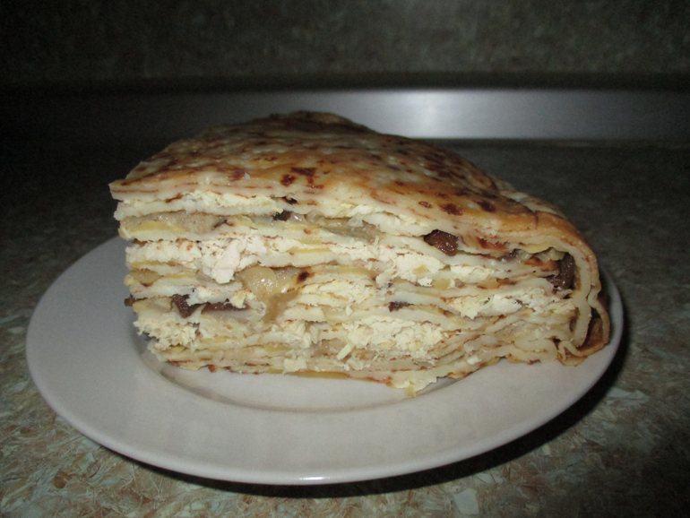 Блинчики обжариваю с одной стороны, заворачиваю конвертом( обжаренная сторона внутри).