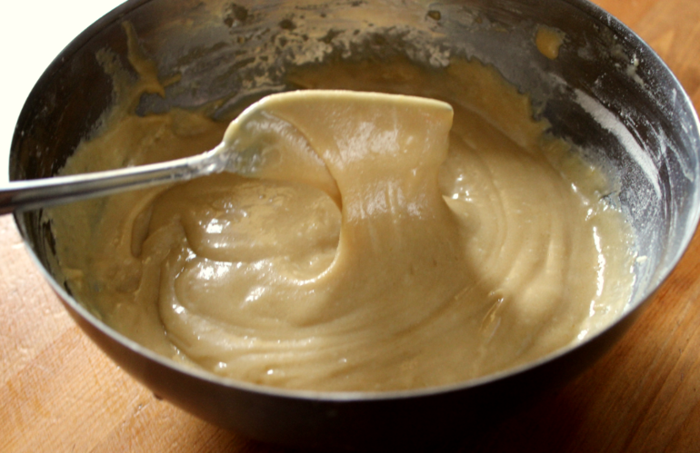 Масло смешать с сахаром. Приготовить кофе: можно приготовить крепкий растворимый кофе или заварной. В масляную смесь добавить 2 столовые ложки остывшего кофе. Затем в масляно-кофейную массу добавить поочерёдно яйца. Далее просеять муку и разрыхлитель. Перемешать тесто. Тесто получается кремообразное, как густая домашняя сметана.