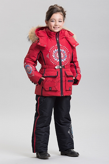 Описание модели: Куртка с двойным пуховым пакетом. Капюшон-шлем съемный накнопках, имеет горизонтальную вставку и центральную вставку свышивкой. Центральная застежка на открытую тесьму-молнию, снижней ветрозащитной планкой. Рукав втачной, регулируемый подлине отворотными манжетами с внутренними ветрозащитнымитрикотажными напульсниками. На нижней части переда боковыепрорезные карманы на молнии. Вход в карманы обработанлисточкой с декоративным кантом. Куртка имеет ветрозащитнуююбку.