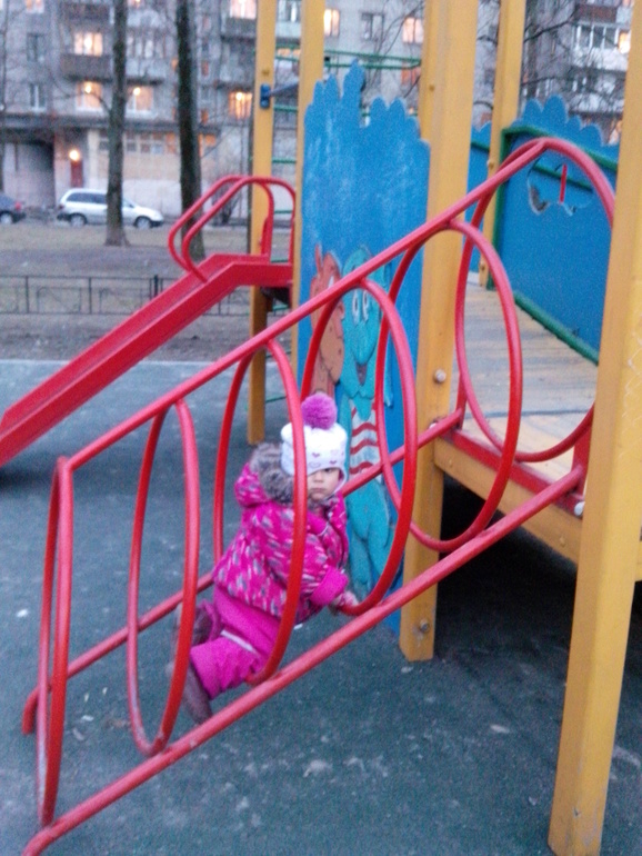 А потом мы пошли гулять и искали круги, квадраты и треугольники. Искать Алиса поняла буквально и залезла под паровозик. Там ничего не нашла. Но потом мы увидели круглые колеса.