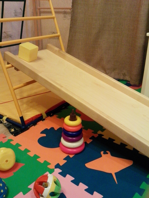 А потом достали горку и проснулись. Катали с горки мячики, кубики и треугольники. Все на удивление съезжало.