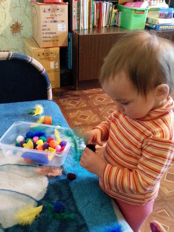 Утром нас ждала сенсорная коробочка с геометрическими фигурами, а также перьями и помпонами. Алиса нашла все фигуры, подула на перья и просто все разбросала:)