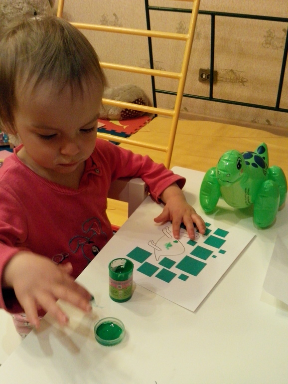 В конце дня порисовали пальчиковыми красками.Закрасили Дино в цвет квадратных камней.