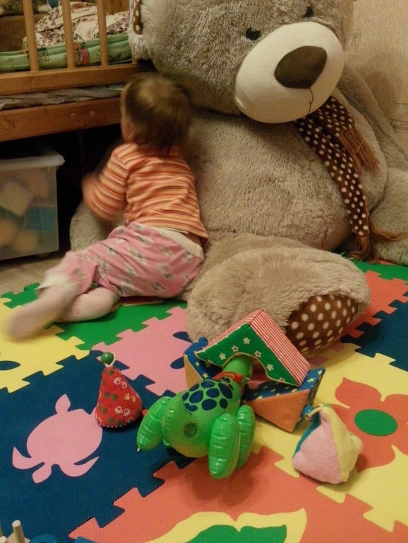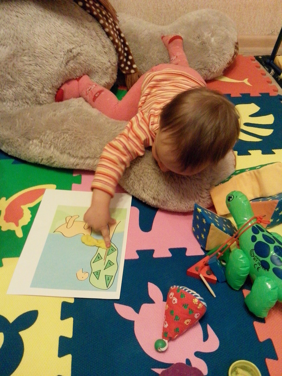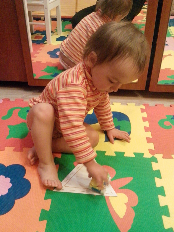 Поиграли с наклейками. Никак Алиса не хотела клеить их в книжку. Ведь вокруг огромный мир: собственный лоб, мамина коленка, стул, шкаф ... Все стало немного треугольным:)