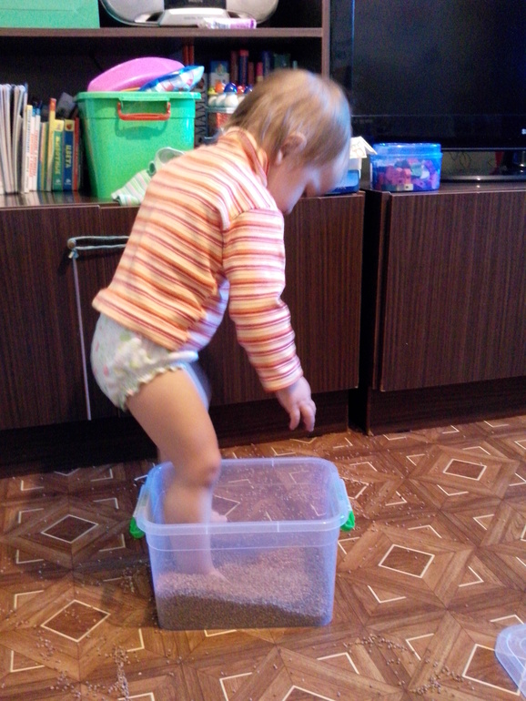 Далее была незапланированная игра - хождение в гречке. Ну очень это дочке понравилось. Заодно и ножки помассажировали:)