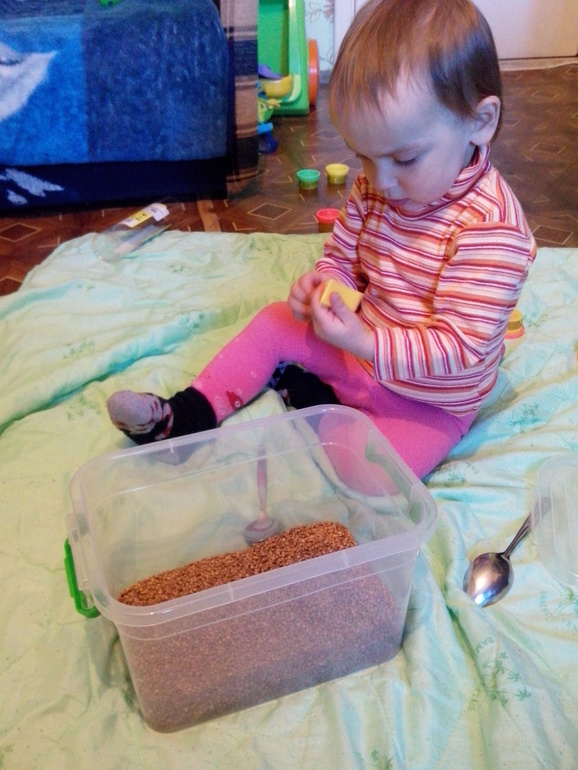 Утро началось с сенсорной коробочки. Алисе нужно было найти треугольнички от сортера в гречке. С этим дочка отлично справилась. Потом немного пересыпали гречку ложкой.