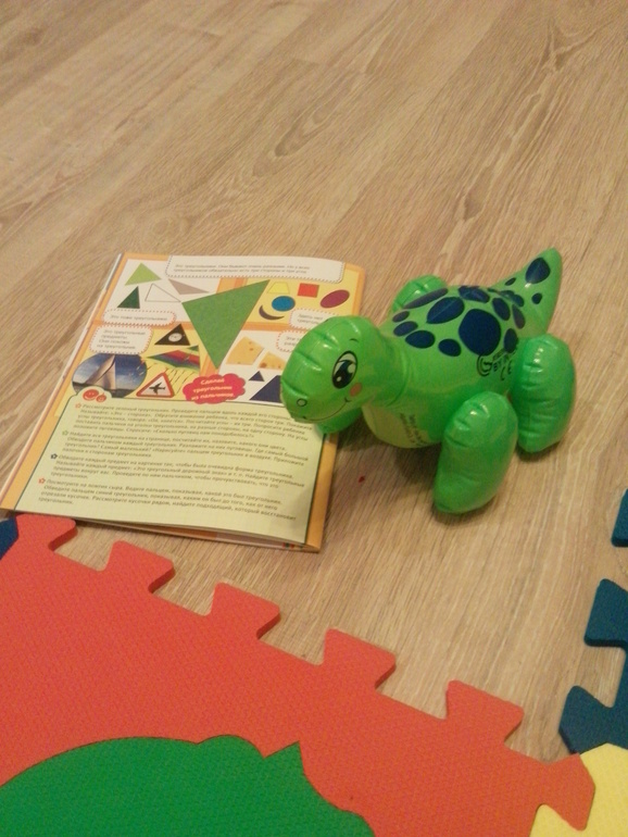 Поиграли с нашими немногочисленными треугольными игрушками и даже сделали для Дино домик.