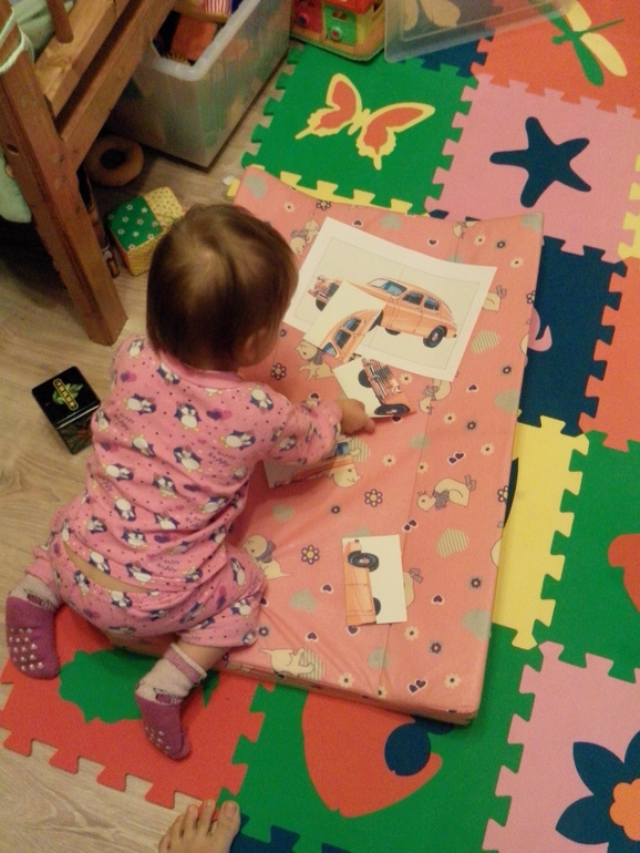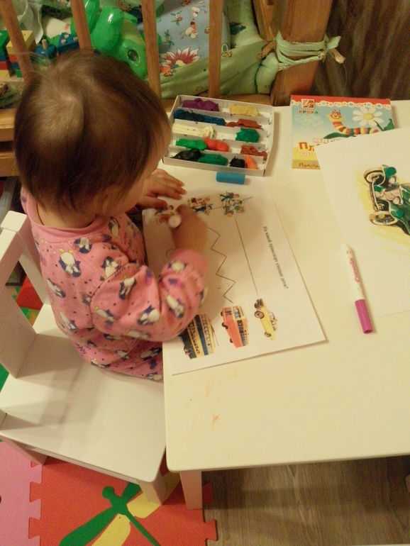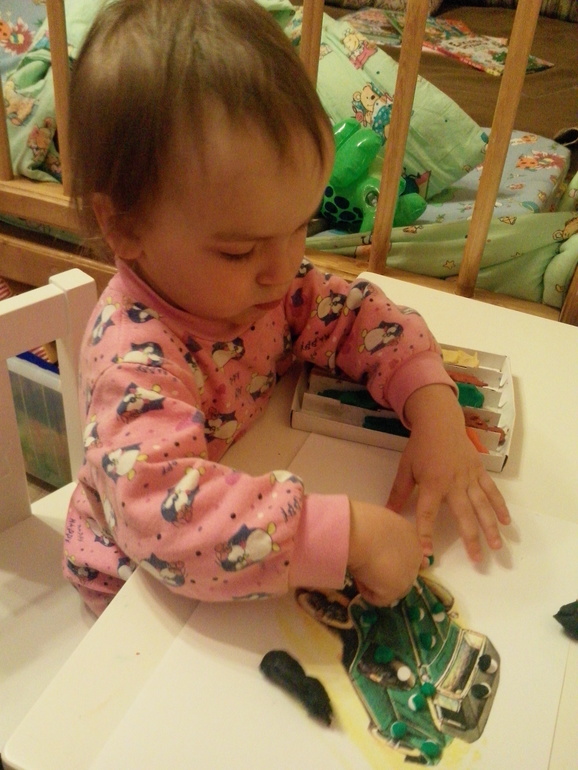 Потом мы собрали пазл машинки и сделали пластилиновые заплатки.Алиса с интересом рассматривала ретро-машины.
